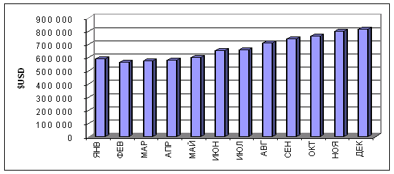 Ежемесячные колебания активности рекламодателей не носили ярко выраженного характера: нижний уровень бюджета составил 564 тыс. $USD (февраль), верхний - 812 тыс. $UDS (декабрь). Вместе с тем в течение всего 2001 года наблюдался небольшой, но стабильный рост бюджетов в наружной рекламе (см. Диаграмму 2). Так же можно сравнить бюджеты первого и второго полугодия 2001 года. За первое полугодие рекламный бюджет составил 3,6 млн. $USD, а во втором полугодии вырос до 4,45 млн. $USD.