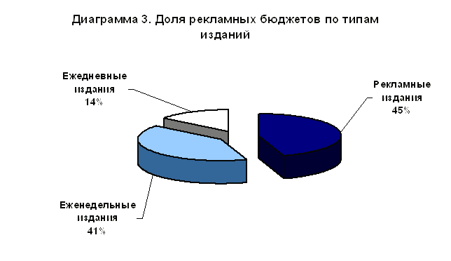 Интересно распределение рекламных бюджетов между типами изданий: ежедневными, еженедельными и рекламными. По сравнению с I-м полугодием 2001 года доля рекламных изданий осталась неизменной - 45%. Среди ежедневных и еженедельных изданий произошли незначительные изменения. Так, у ежедневников доля рекламных денег, вложенных в них, сократилась на 1%, тогда как среди еженедельников рекламные бюджеты выросли на этот самый 1% (см. Диаграмму 3).
